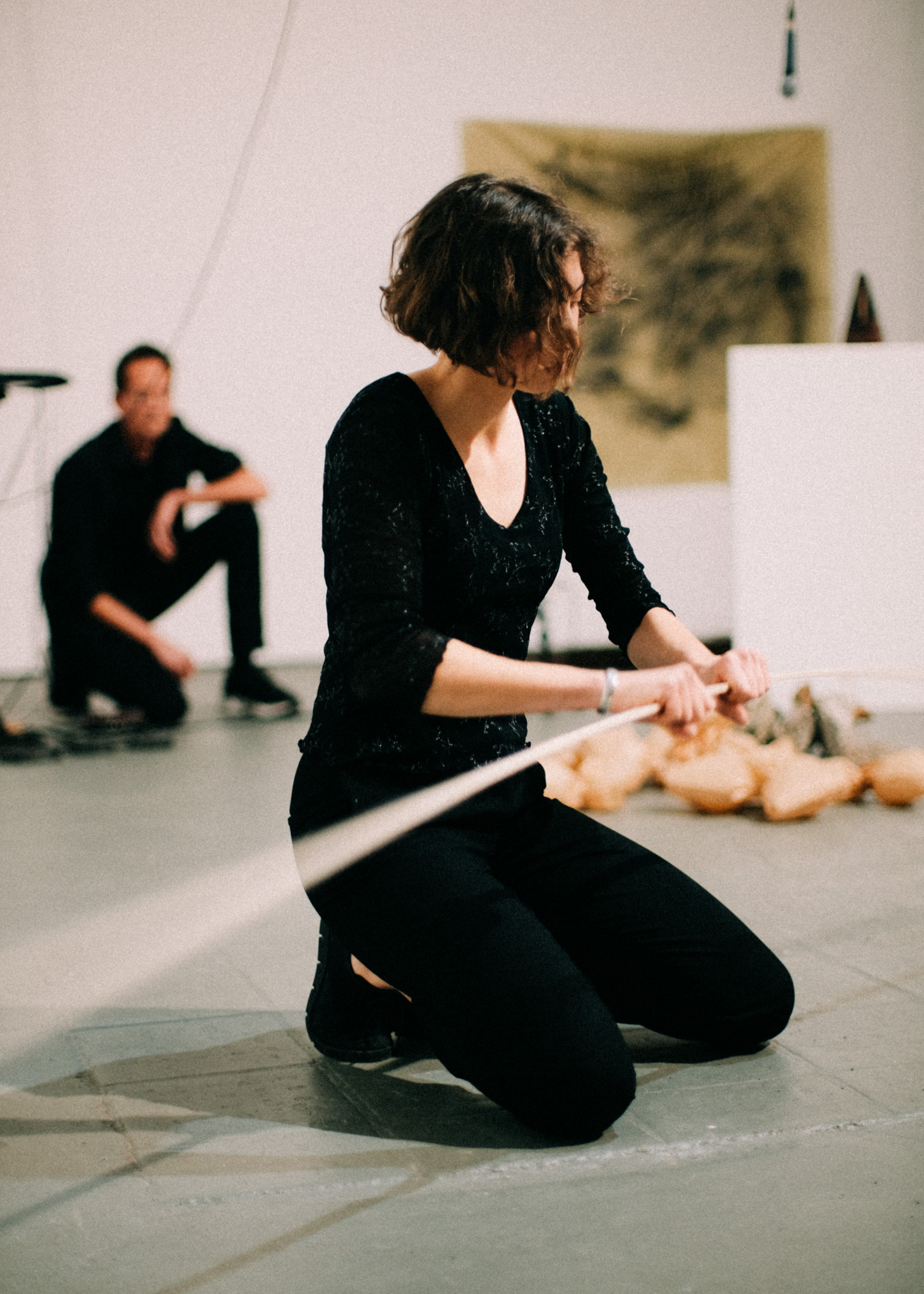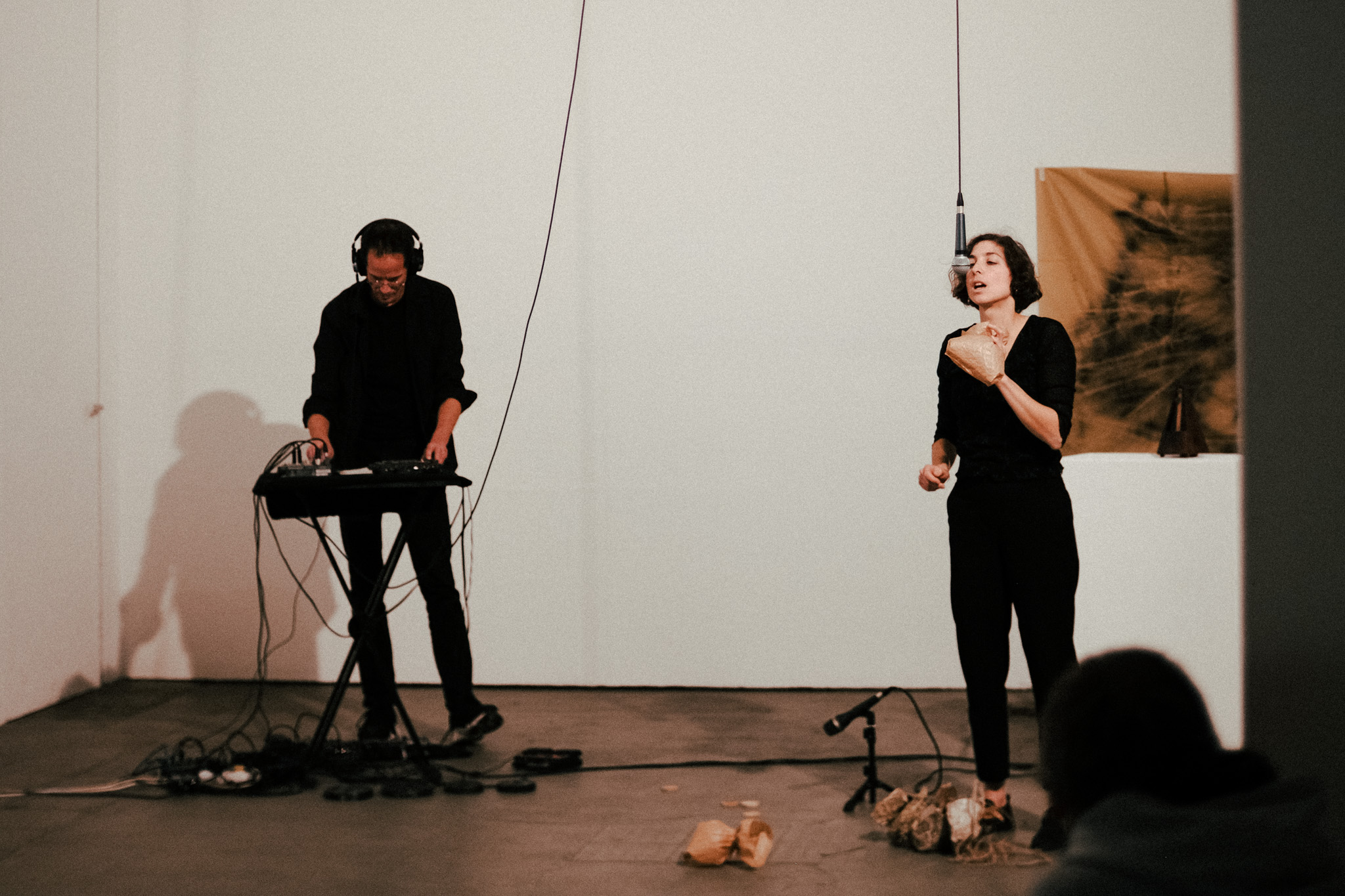 Anaïs Héraud-Louisadat is a performer and visual artist, while Till Baumann is a musician and sound artist. In their collaborative performances, sound and image intertwine, repeating and transforming live in the moment. Poems, anagrams, or even single words serve as the score for a series of performative actions.